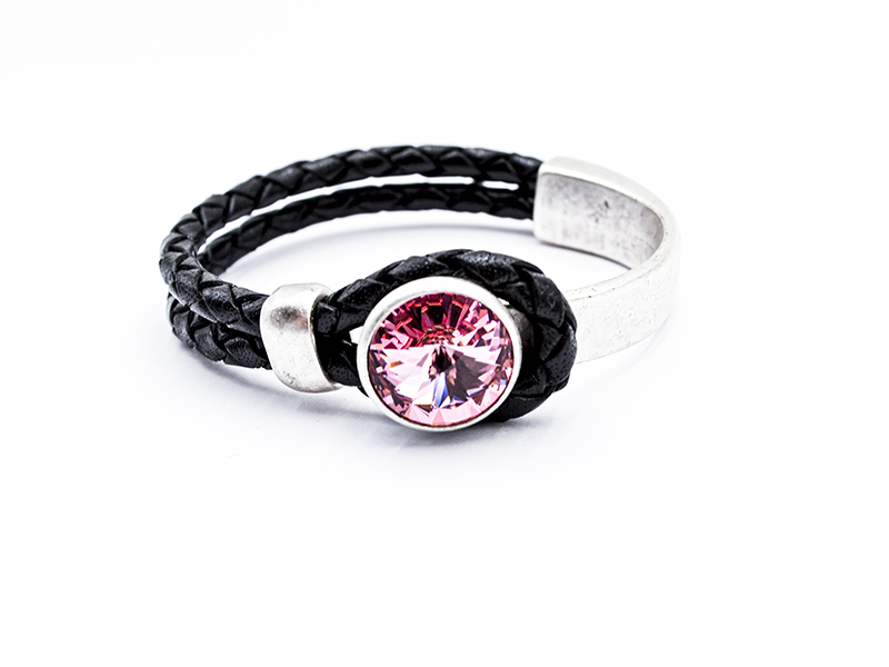 Diese glamourösen Armbänder verleihen garantiert jedem Outfit einen luxuriösen Hauch. Das geflochtene, gefärbte Lederarmband geht in einen Metallreif aus ZAMAK über, und wird mit einer Schlaufe über den Zierknopf mit dem eingesetzten Premium Crystal Rivoli Stein verschlossen. Das Armband ist in zwei verschiedenen Größen erhältlich.
